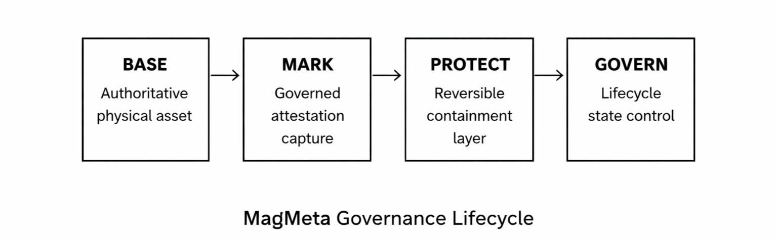 MagMeta has developed reversible, non-destructive systems and methods for preservation, protection, and authentication of high-value physical assets across their lifecycle.The company defines a governance-layer method architecture for physical asset authentication. The system enables reversible attestation, lifecycle verification, and institutional chain-of-custody control without permanent alteration of the underlying artifact.MagMeta operates at the governance layer of physical asset trust systems. Traditional authentication verifies an object at a moment in time, but it does not govern the lifecycle transitions that follow. MagMeta’s architecture introduces a reversible governance framework that enables attestation, authentication, custody control, inspection, and restoration without permanently altering the underlying artifact.⸻The ProblemTraditional verification systems bind proof directly to the surface of the asset.Ink signatures, embossed seals, tamper labels, and other permanent markings irreversibly alter the substrate. As asset value and regulatory scrutiny increase, institutions face a structural trade-off between preservation and authentication.⸻The MagMeta ApproachMagMeta reframes trust as a governed lifecycle condition, rather than a permanent surface event.Authentication and attestation become reversible state transitions that remain inspectable across custody, storage, transfer, and restoration.The underlying asset remains the authoritative physical reference, while verification overlays remain separable from the substrate.⸻Lifecycle DoctrineMagMeta’s architecture is structured as a governed lifecycle sequence:Base